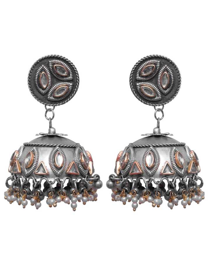 Boho Fashion Oxidised Silver Jhumka Earrings for Girls Falak Kundan Studded Geometric Pattern Jhumka Earrings