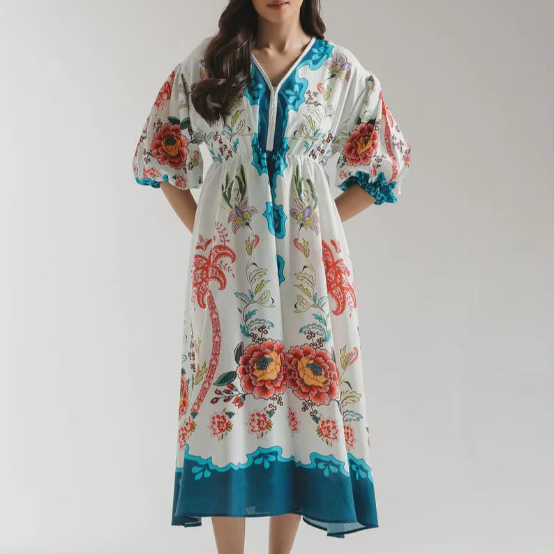 Boho Floral Maxi Dress Handmade Summer Kaftan with Puff Sleeves Beach Resort Vacation Outfit Bohemian Midi Dress