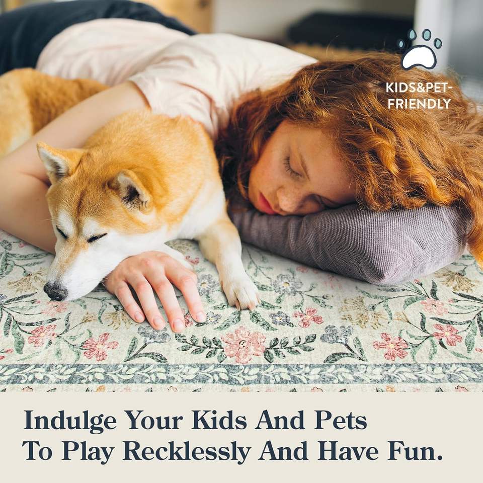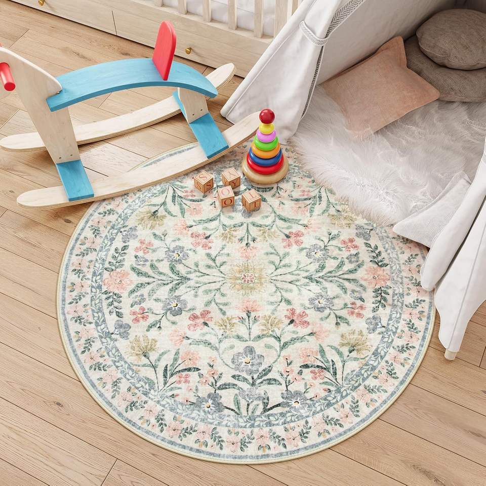 Boho Floral Round Rug Cream Beige Tufted Eco-Friendly Low Pile Non-Slip Soft Washable Print on Demand for Bedroom