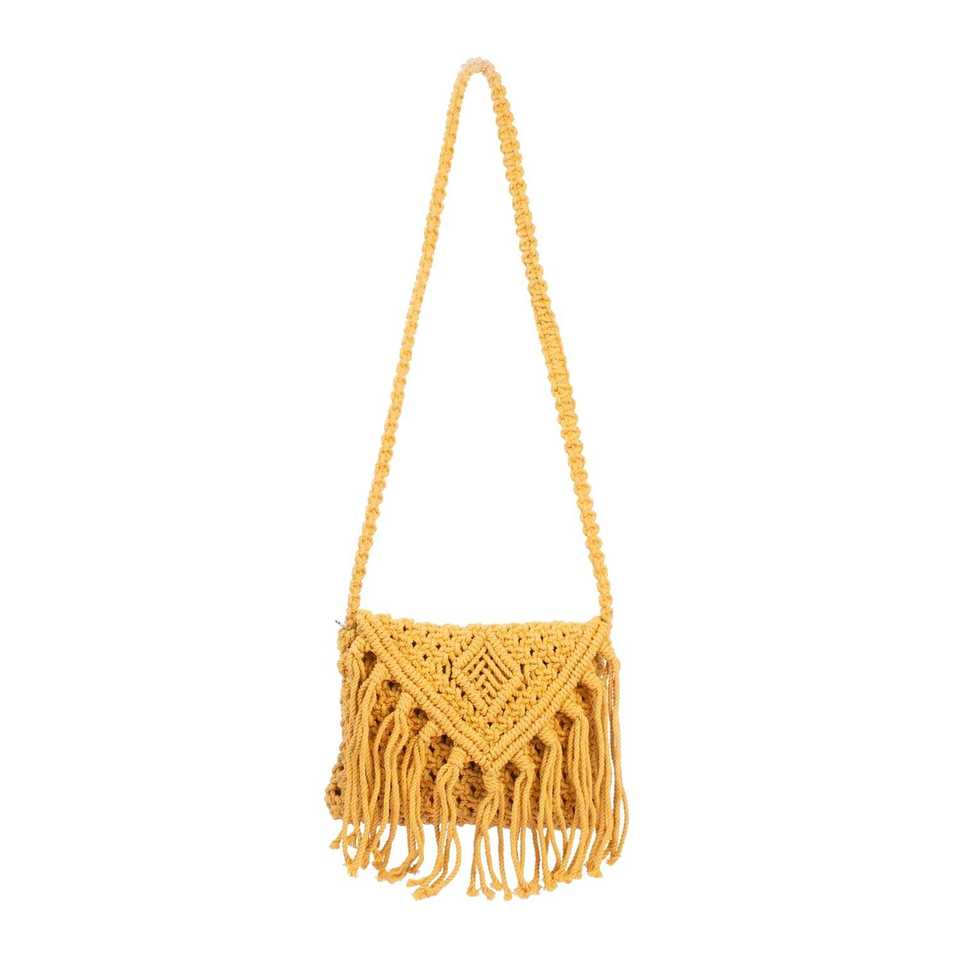 Boho Handmade Mustard Yellow Macrame Sling Bag with Chevron Flap and Fringe Stylish Shoulder Bag for Women