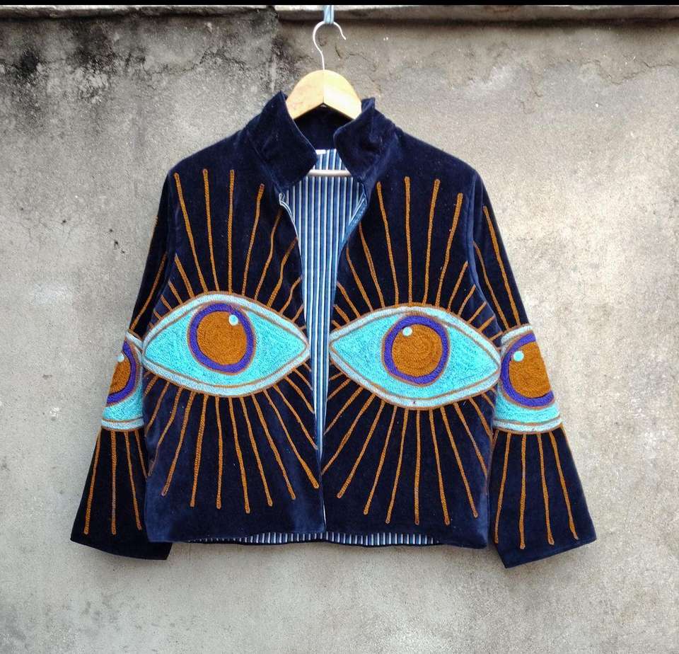 Boho Hippie Winter Coat Evil Eye Velvet Embroidery Printed Techniques Wool Lining Protective Symbol Jacket Button Printed