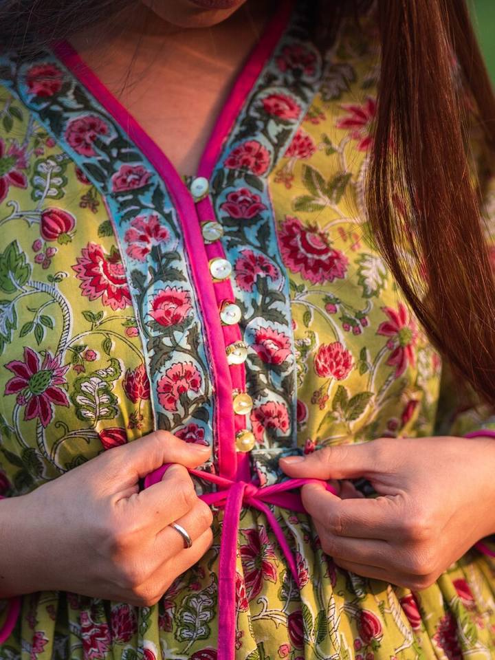 Boho Kathana Midi Dress Floral Green Pink Hand Block Print Pure Cotton Casual Occasional Ethical Clothing