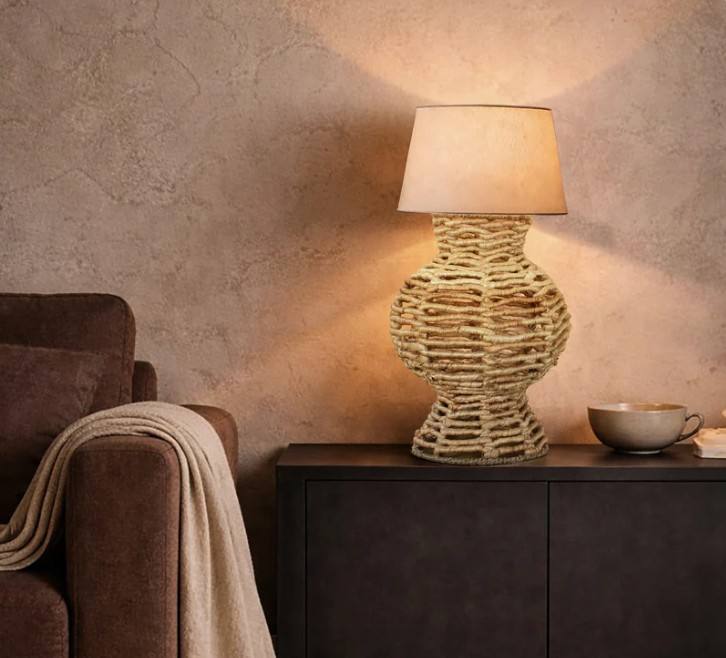 Boho Rattan Table Lamp | Eco-Friendly Woven Rope Base with Dome Fabric Shade | Hotel Use Decorative Bedside & Living Room Light