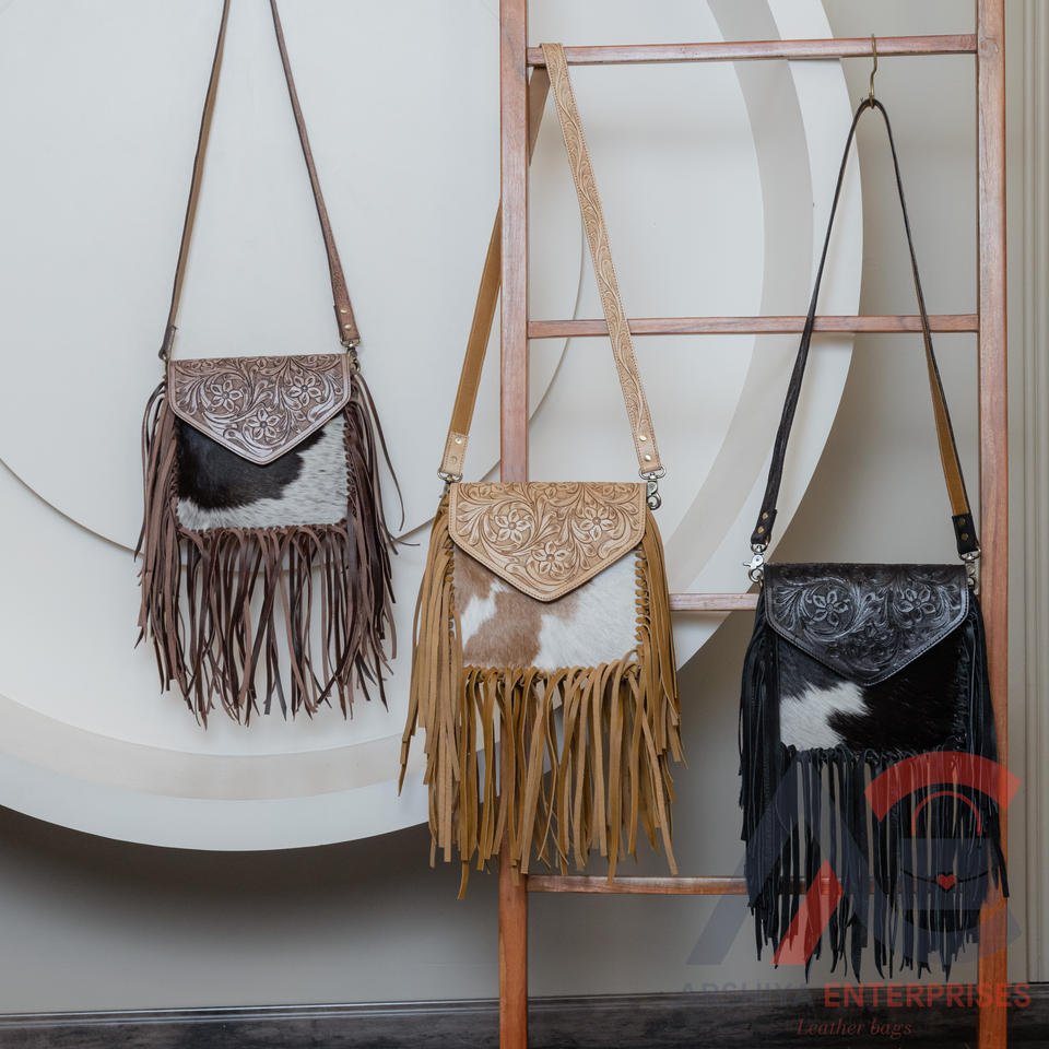 Boho Style New Handcrafted Tooled Cowhide Leather Western Fringe Handbags Stylish Hot Selling Genuine Leather Crossbody Purses