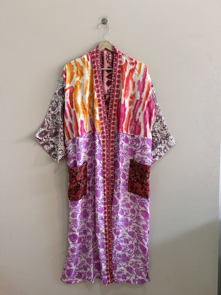 Boho Style Women's Silk Kimono Indian Patchwork Robe Perfect Vacation Wear Nightwear V-neck