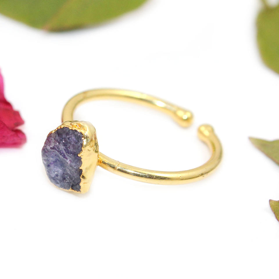 Boho Style Womens Handmade 24K Gold Electroplated Natural Rough Blue Sapphire Gemstone Ring Adjustable Wholesale Jewelry India