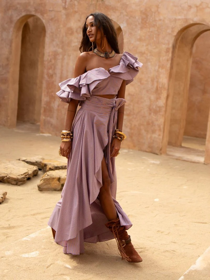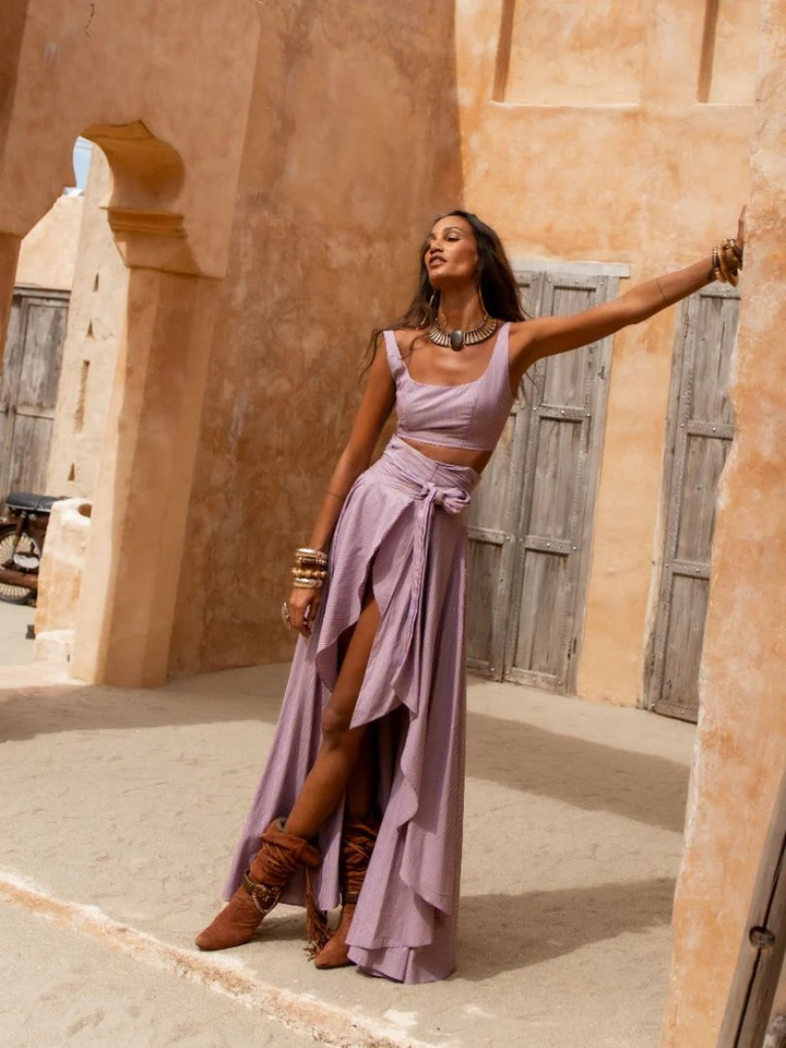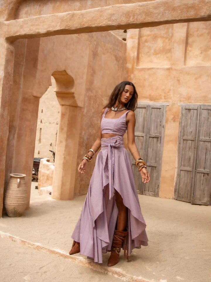 Boho Two Piece Eco-Friendly Maxi Dress Set Crop Top High Low Skirt with Sashes Natural Waist Belt Womens Bohemian