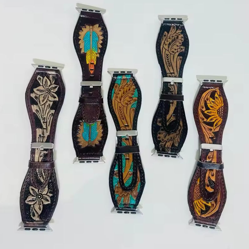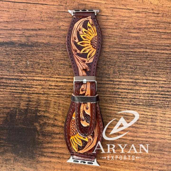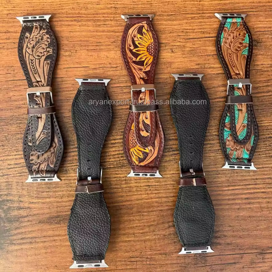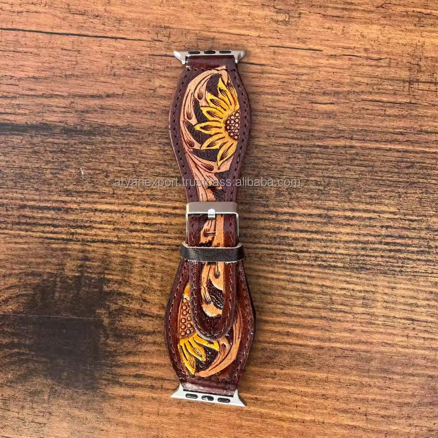 Boho Western Hand Painted Sunflower Tooled Leather Smart Watch Straps Stylish Phone Watch Band Real Genuine Leather Straps