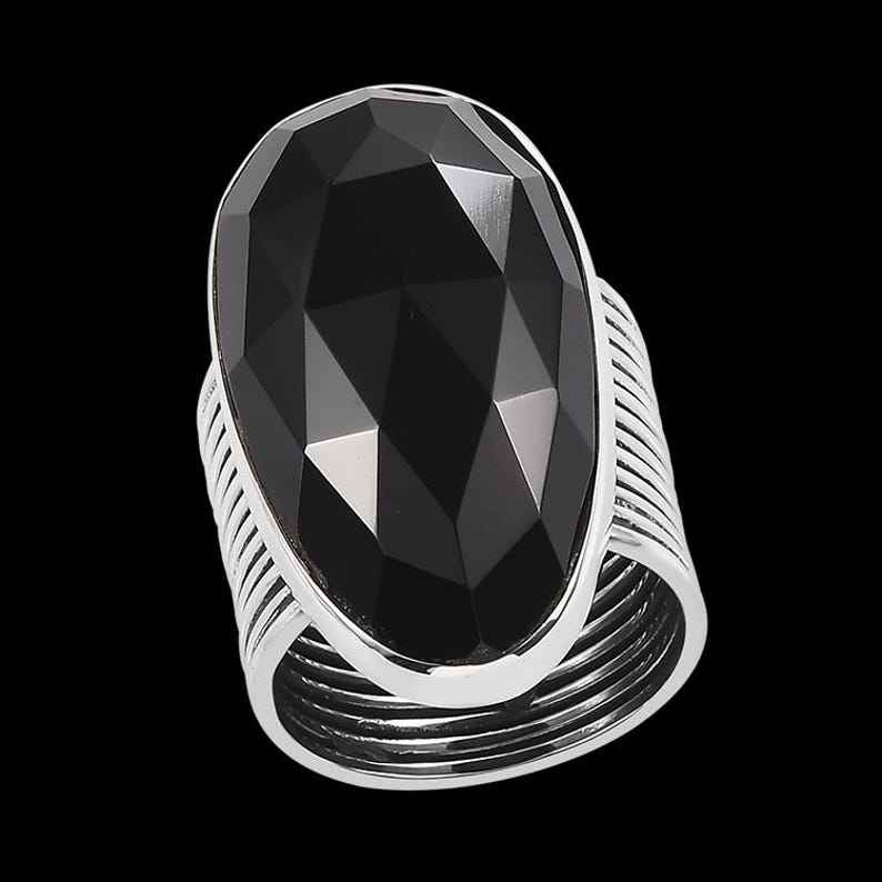 Bold Black Onyx Ring Sterling Silver Large Oval 16x31mm Faceted Gemstone Adjustable Statement Cocktail Ring For Women
