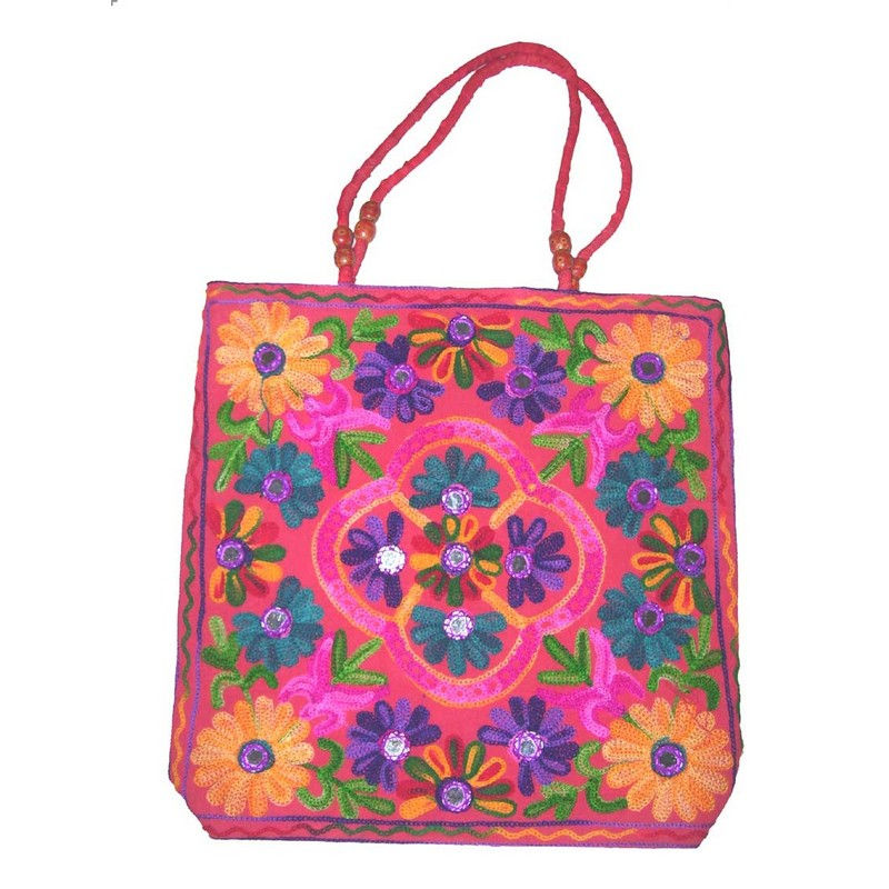 Bold Boho Style for Pink Floral Embroidered Tote Bag Large Capacity Portable Zipper Closure Cotton Artistic Shopping Design