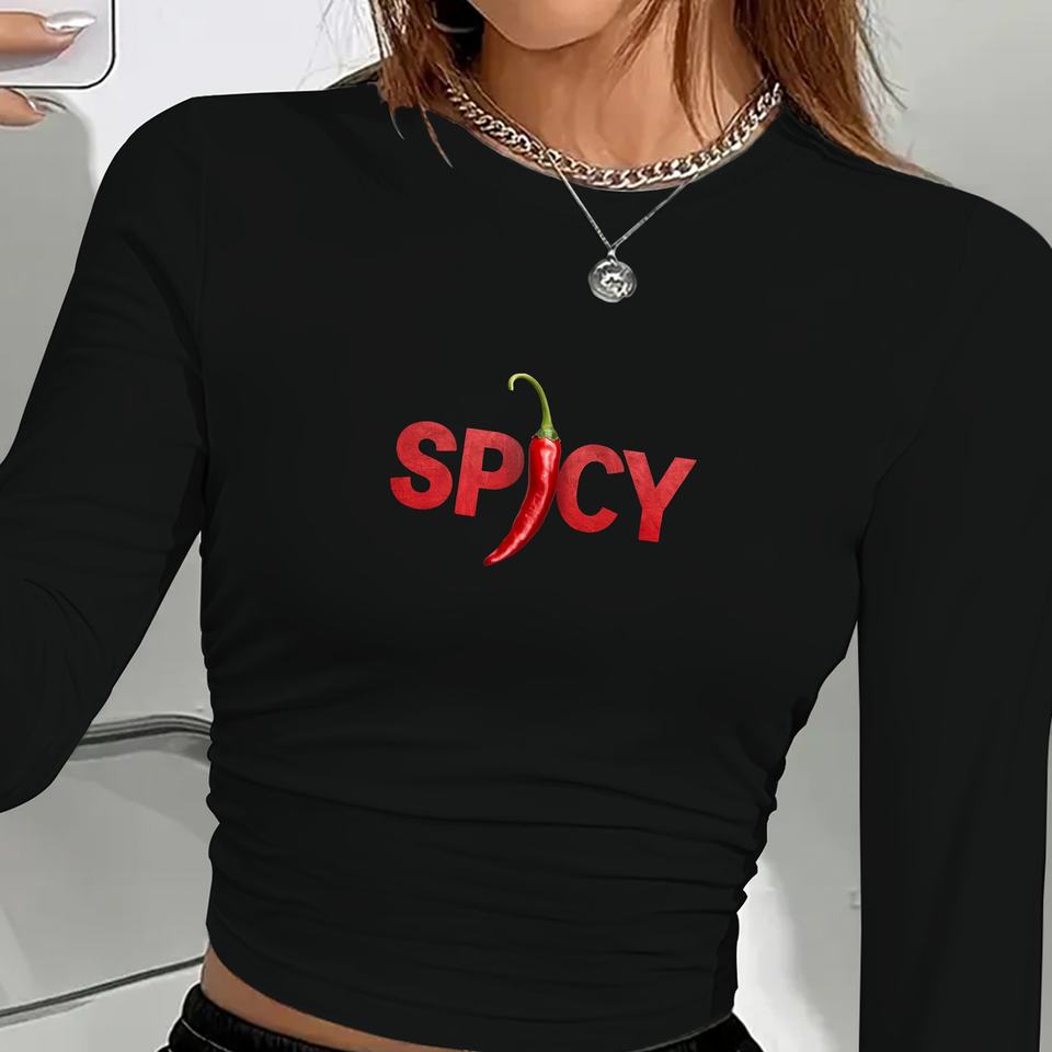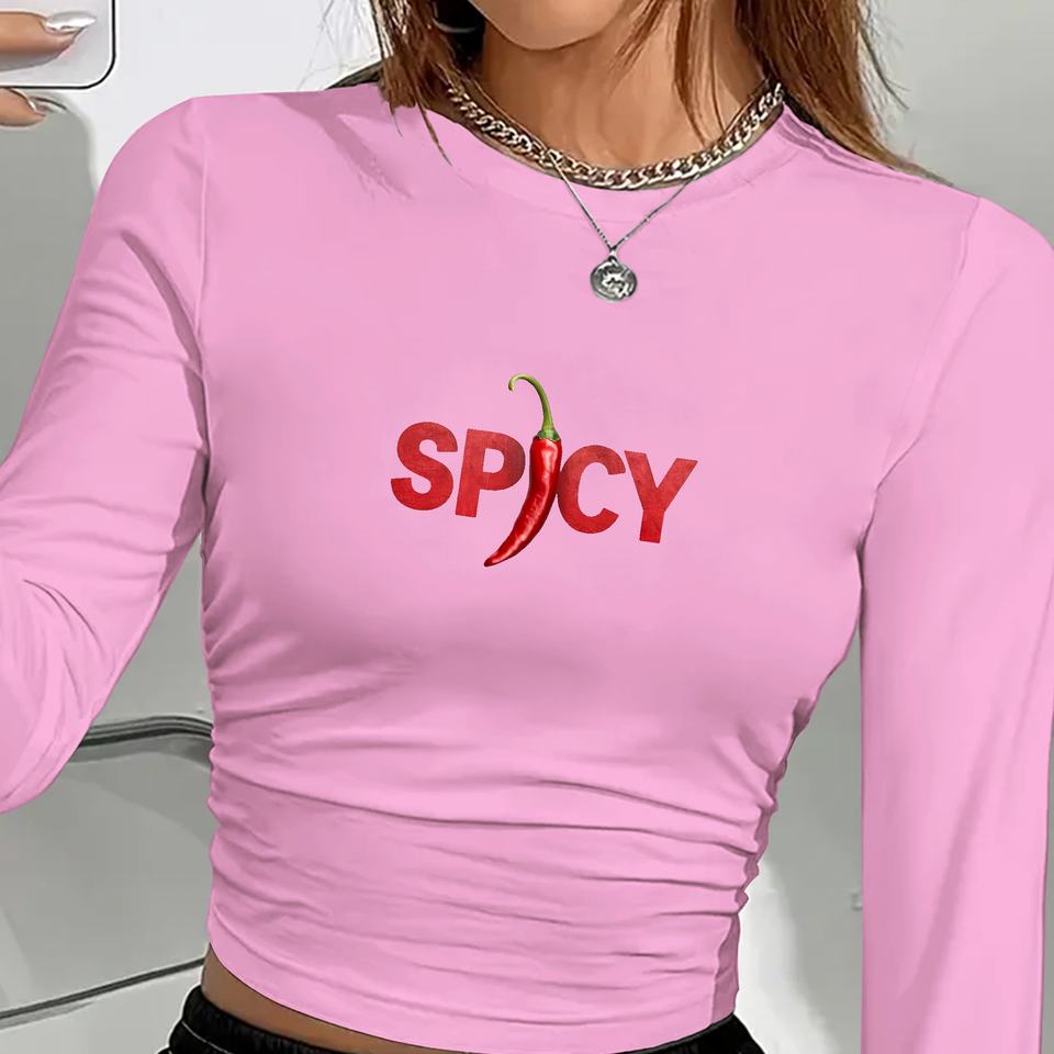 Bold Fiery Red Women's Fashion Long Sleeve Shirt SPICY in Y2K Style Knitted Fabric with Printed Pattern