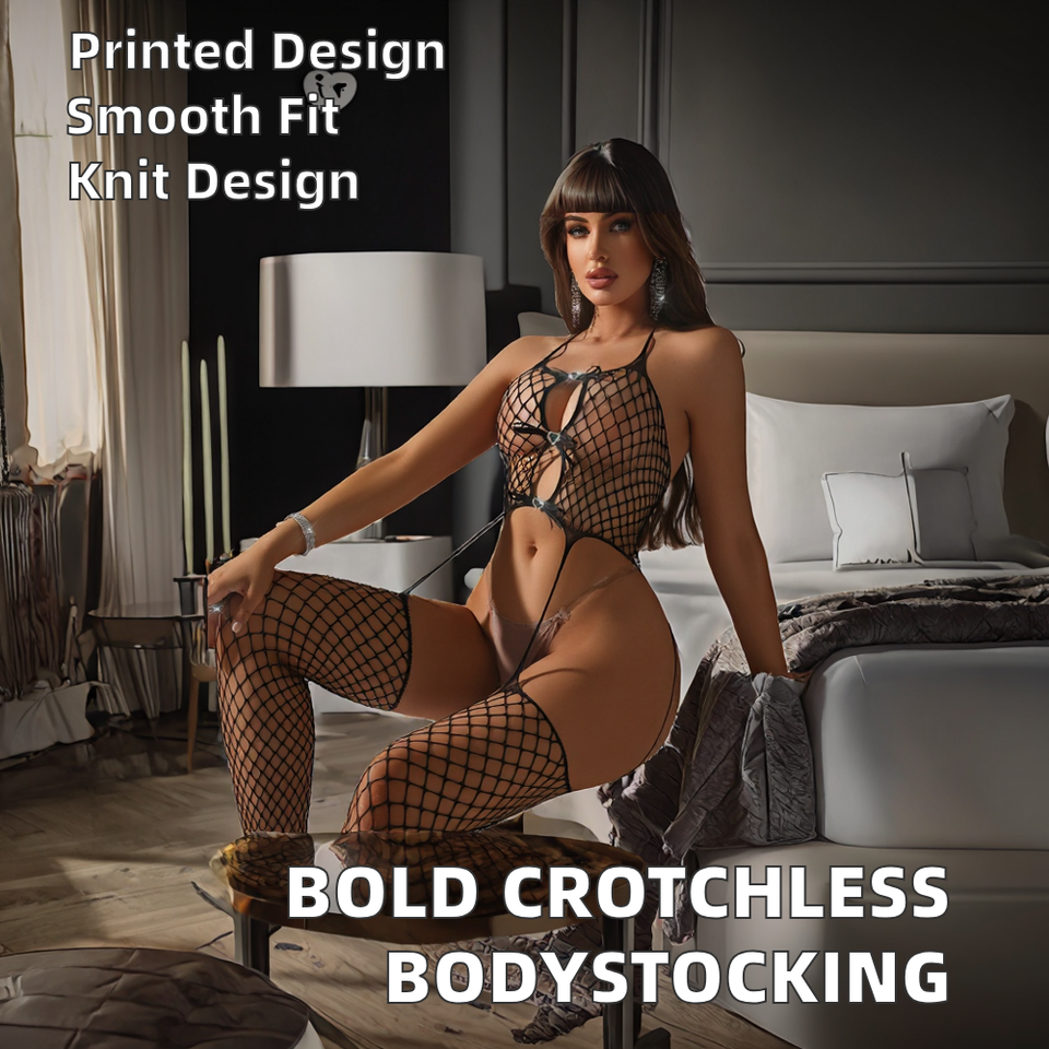 Bold Transparent Satin Fishnet Lingerie Bodystocking Sexy Erotic Costumes Open Crotch Pantyhose Decorative Hole Nail Bead