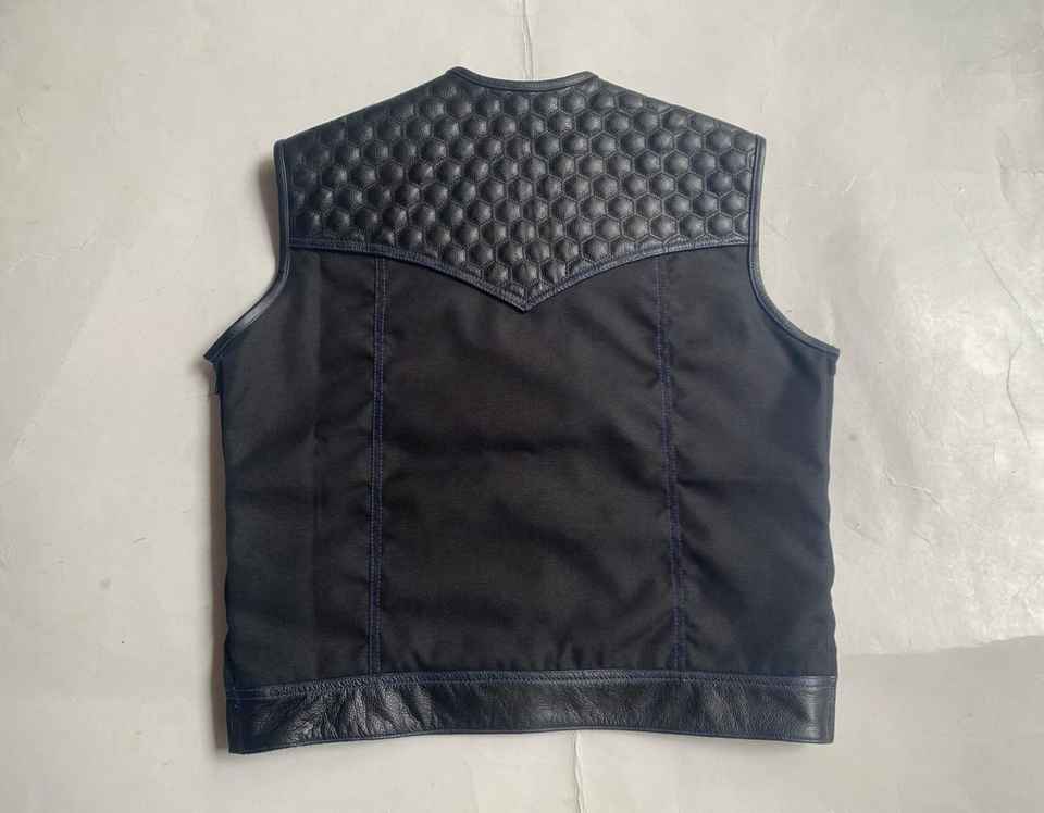 Bold Black Color Scheme Outer Wear Breathable Vest Leather and Canvas with Contrast Stitching Full Size Covered Button Closure