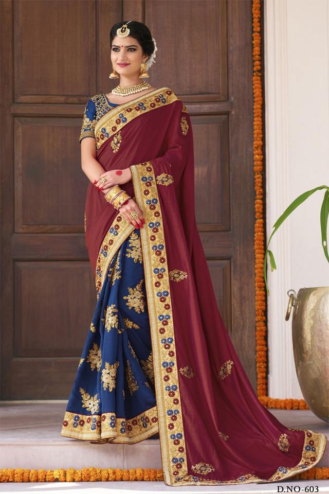 Bollywood Designer Saree Designer Mirror Work Flower Design Soft Silk Fabric Digital Print Maroon Color Sari with Blouse India ApparelGarment