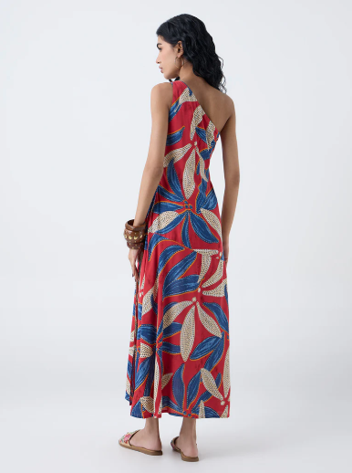 Bombay Paisley Red Foliage Pattern One-Shoulder Dress