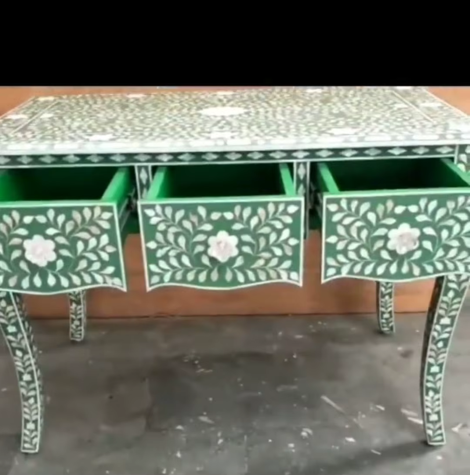 Handcrafted Modern Console Table with Zig-Zag Bone Inlay Pattern Black Resin Finish for Elegant Living Room Stools