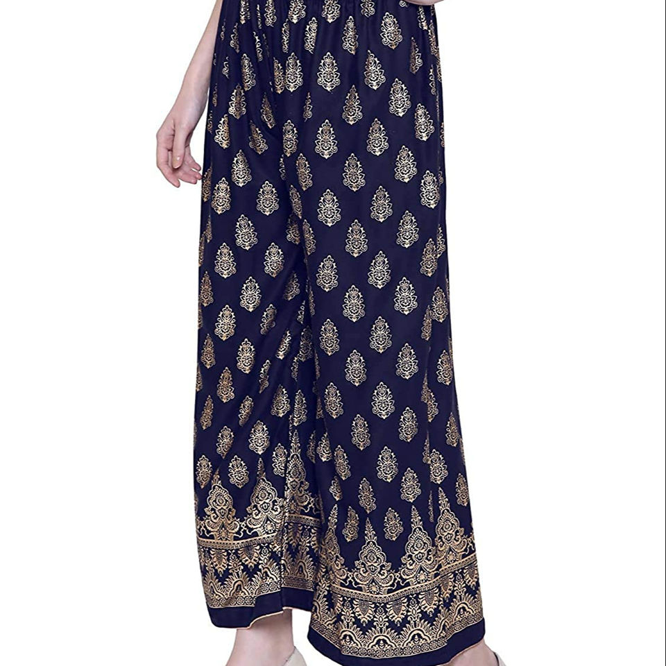 Bonhomie Boho Hippie Gypsy Palazzo Pants Comfortable Rayon Gold Print Black Casual Lounge Wide Yoga Pant Plus Size Flat