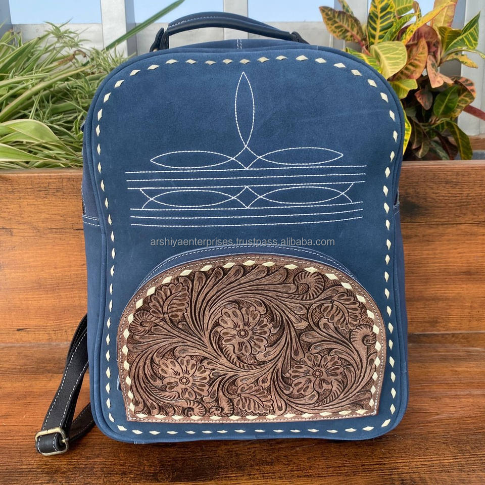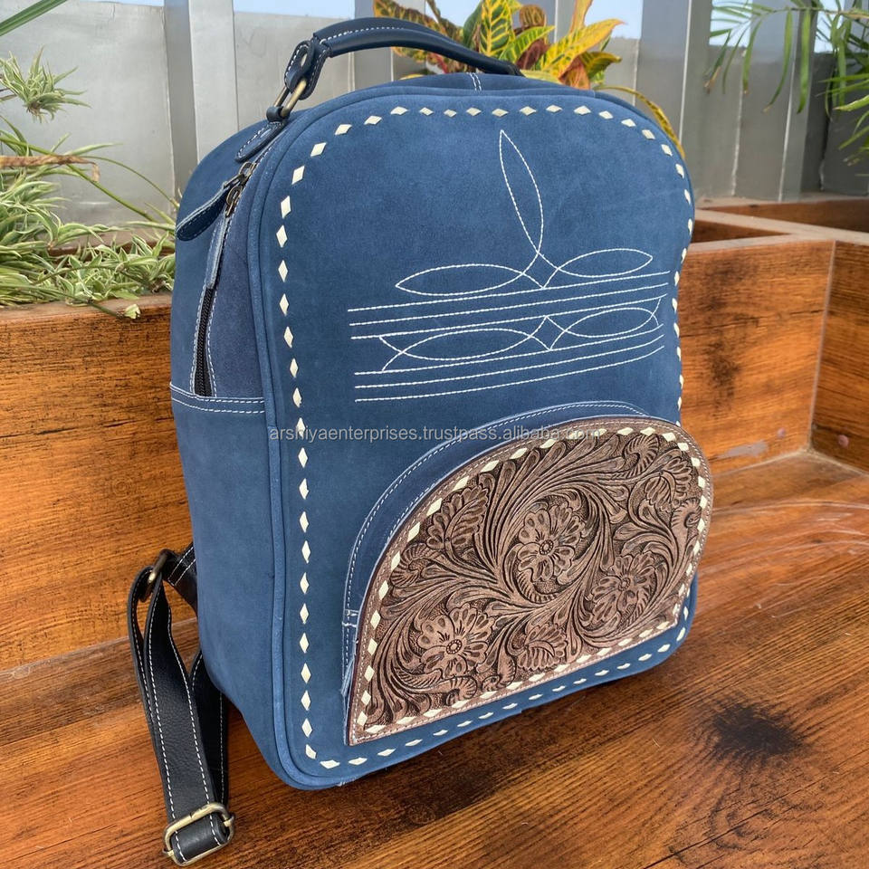 Boot Stitch Hand Tooled Blue Suede Leather Backpack Western Floral Travel Luxury Hand Stitch Leather Small Backpack for Women's
