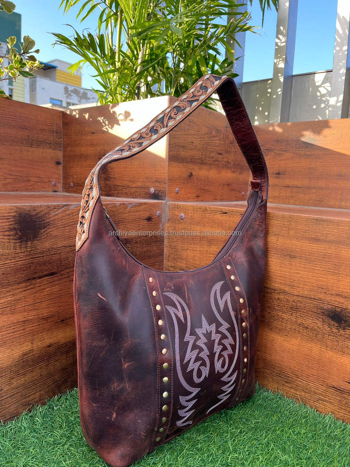 Boot Stitch Hand Tooled Genuine Leather Large Hobo Bag for Women's Western Cowhide Leather Handbag Concealed Carry Shoulder Bags