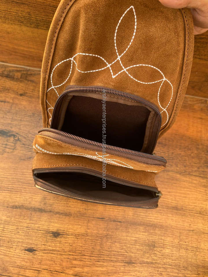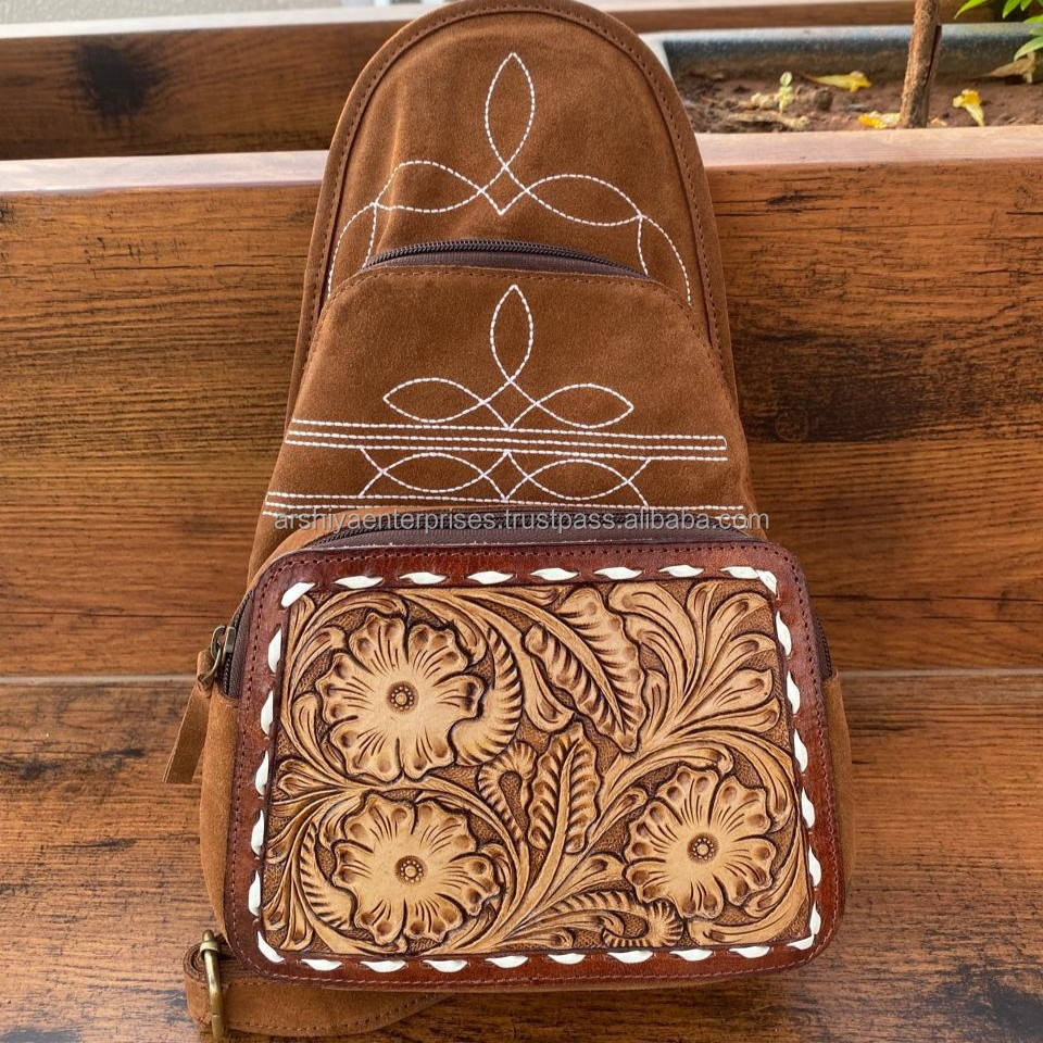 Boot Stitch Hand-tooled Tan Suede Leather Chest Bag with Backpack Western Genuine Leather Floral Crossbody Sling Bags for Women
