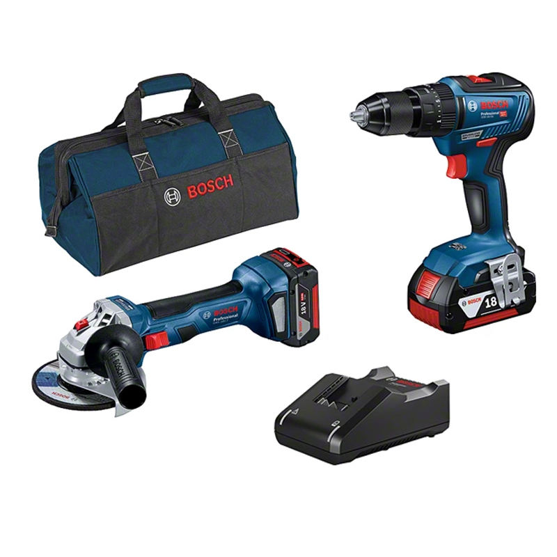 Bosch GSB-18V-55 drill and GWS 18V-7 grinder kit with 2 x 4.0Ah batteries, charger and bag