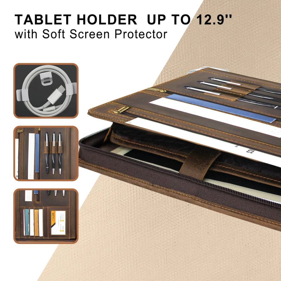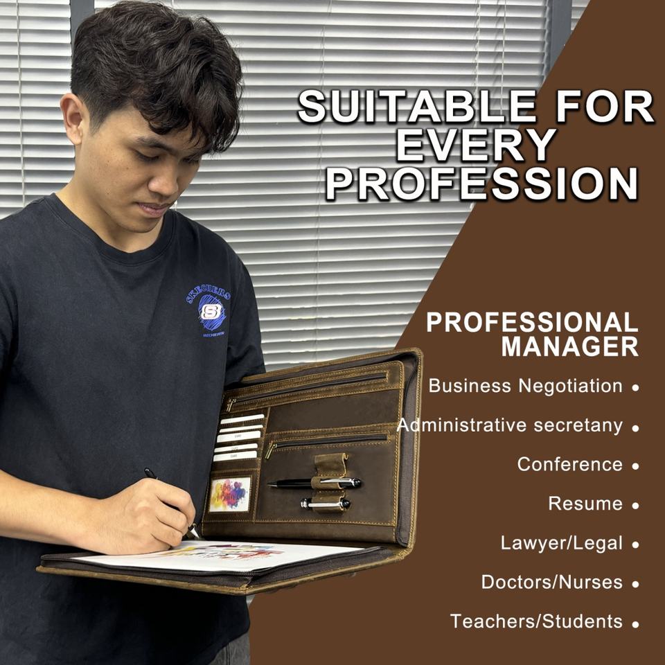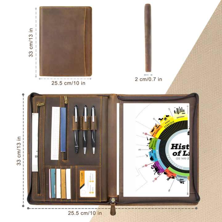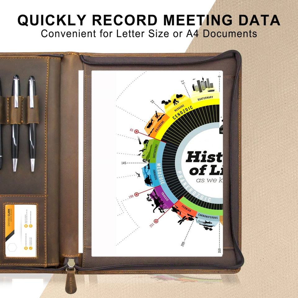 Boshiho Factory Premium Zipper File Folder Cover Crazy Horse Genuine Leather Legal Pad Padfolio Stylish A4 Portfolio Folder