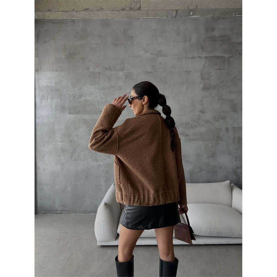 Boucle Fleece Jacket Women Brown Autumn Full Sleeve Style S