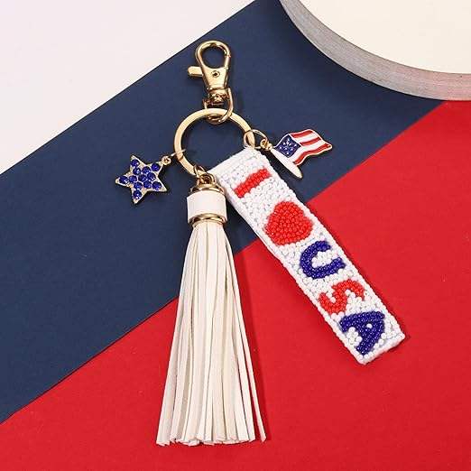 Boutique I Love USA Heart Beaded Embroidery Keychain White Leather Tassel Blue Star Charm Rectangular Bags Jewelry Keyring Gifts