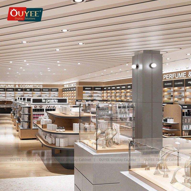 Boutique Store Design Duty Free Store Fixture Cloth Shelf Display Wooden Female Accessories Perfume & Cosmetic Display Shelves