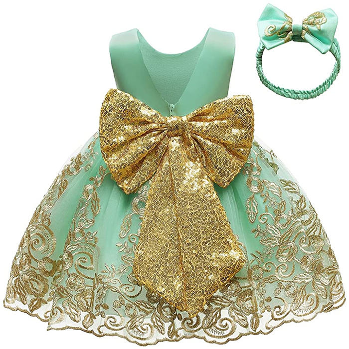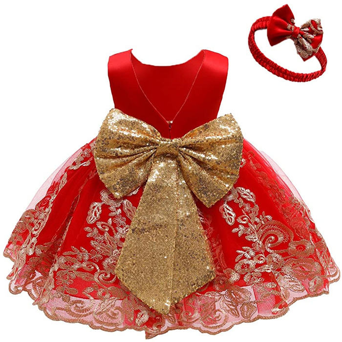Bowknot Sequins Embroidered Lace Party Tutu Gown Toddler Baby Girls Dress Designs With Head Wear