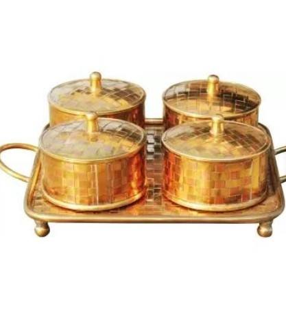 Bowl Set of 4 Bowls With Brass Designer Lid and Tray for Home and Tableware Decorate Gold Brass Dry Fruits Serving