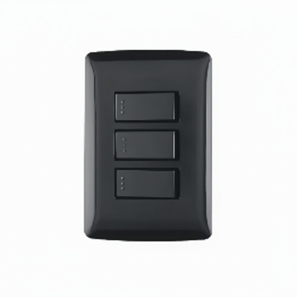 Box with 3 units. Assembled plate with 3 single switches, black, Italian line.