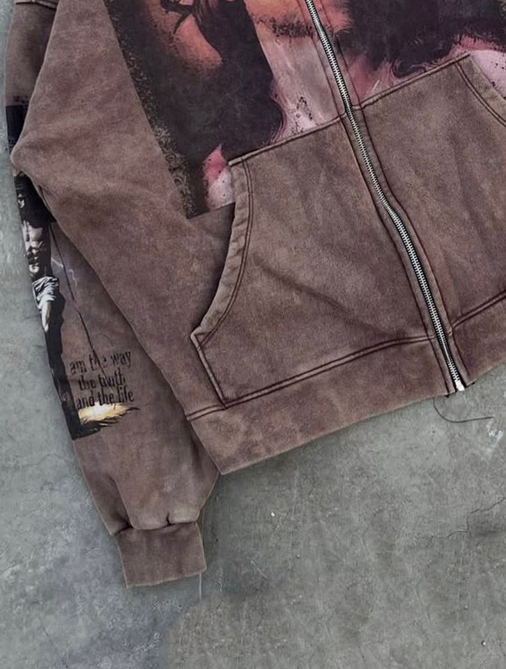 Boxy Custom logo Graphic Printing Vintage French Blank Streetwears Distressed Sweatsuit Acid Washed Zipper Hoodie Sets