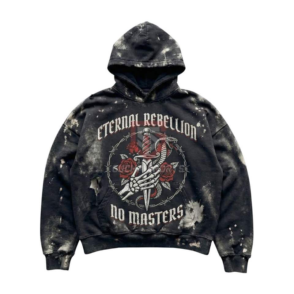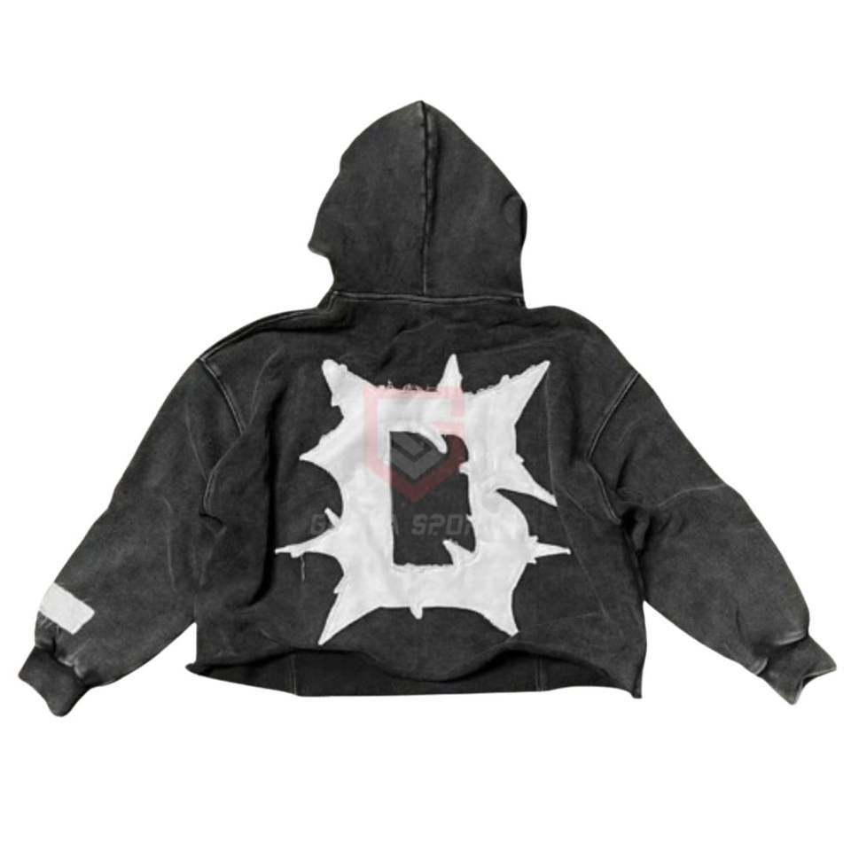 Boxy Fit Black Acid Wash Hoodie Cropped Style Heavyweight Cotton Fleece Puff Print Streetwear Hoodie