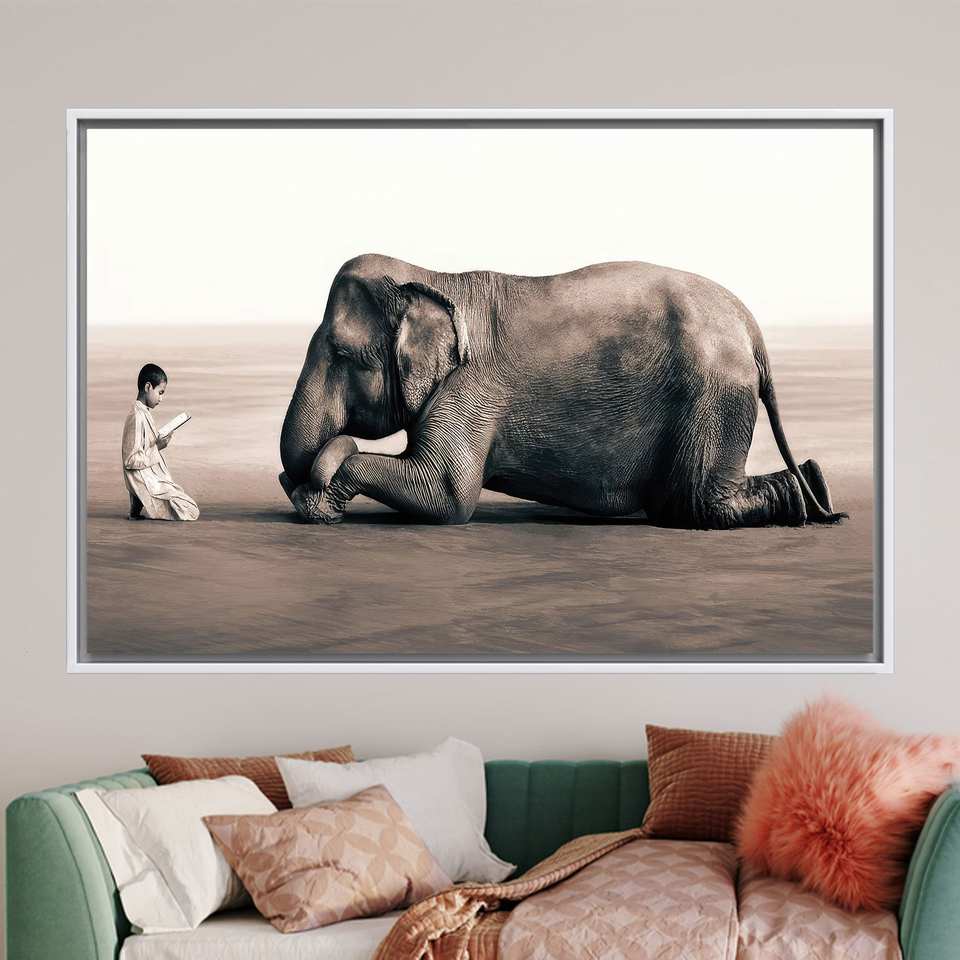 Boy Reading Printed Canvas Art, Modern Elephant Wall Decor,1P:White Framed