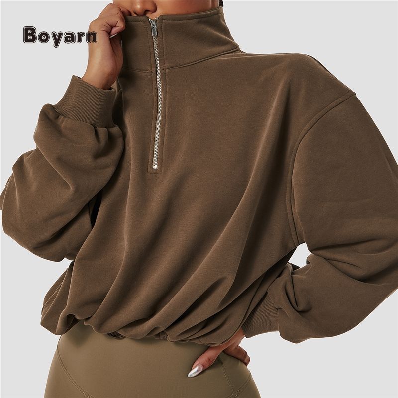 Boyarn Winter Outdoor High Collar Long Sleeve Running Sweater Plus Size Windproof Plain Women's Drop Shoulder Half Zip Cropped