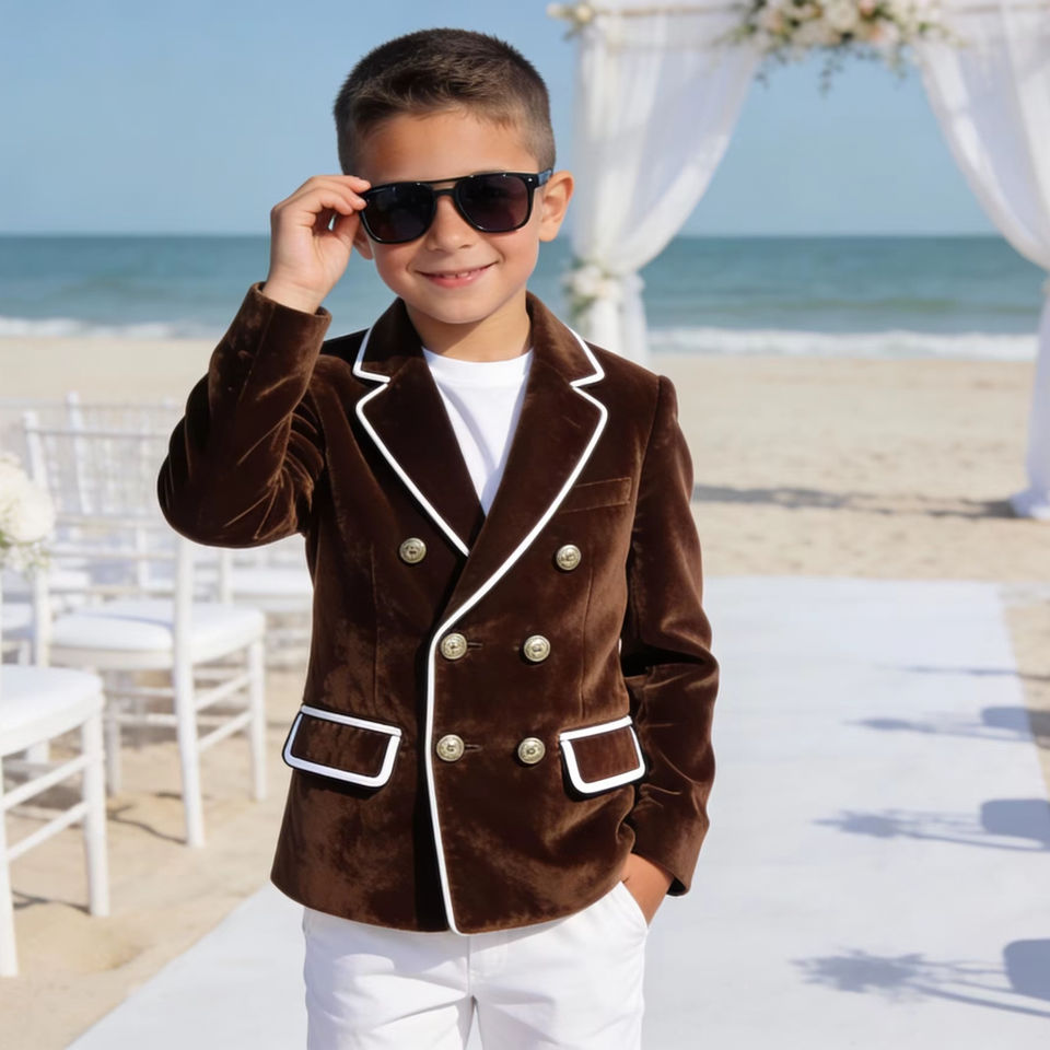 Boys Brown Velvet Double Breasted Blazer Suit for Weddings, Beach Ceremonies & Formal Events