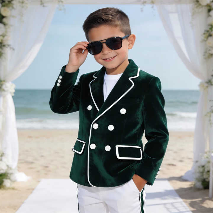 Boys Dark Green Velvet Double Breasted Blazer Suit for Weddings, Beach Ceremonies & Formal Events