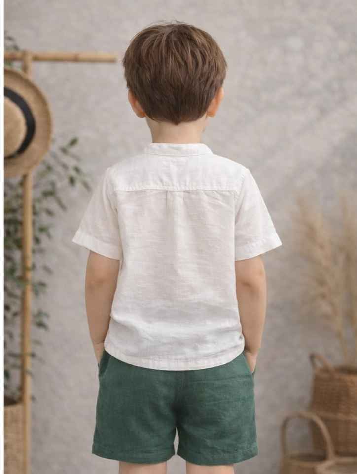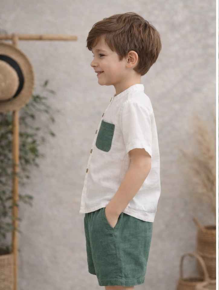 Boys Cotton Linen Shirt & Shorts Set | Summer Breathable Kids Outfit Green and White with Pocket India Made