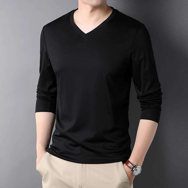 Brand New 100% Cotton V-neck T-shirt High Quality Blank Casual Knitted Men Long-sleeved Solid Color Breathable
