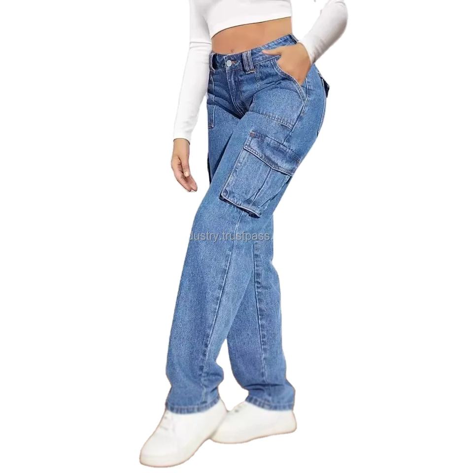 Brand New Women's High-Waist Retro Workwear Cargo Pants Casual Straight Multi-Pocket Tassel Plus Size American Denim Jeans