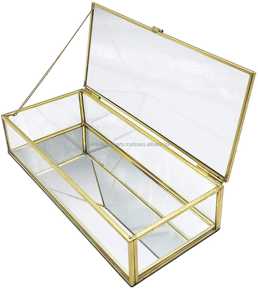 Brass and Glass Retro Transparent Glass Jewellery Box, Decorative Box, Gold Geometric Terrarium Box for Living Room,