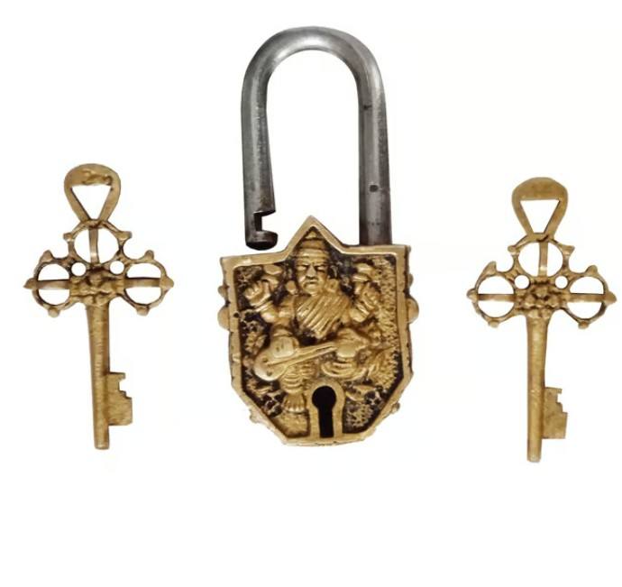 Brass Antique Padlock Saraswathi Design Small Vintage Style Lock Collectible Decorative Brass Lock for Home Temple Gift Usage