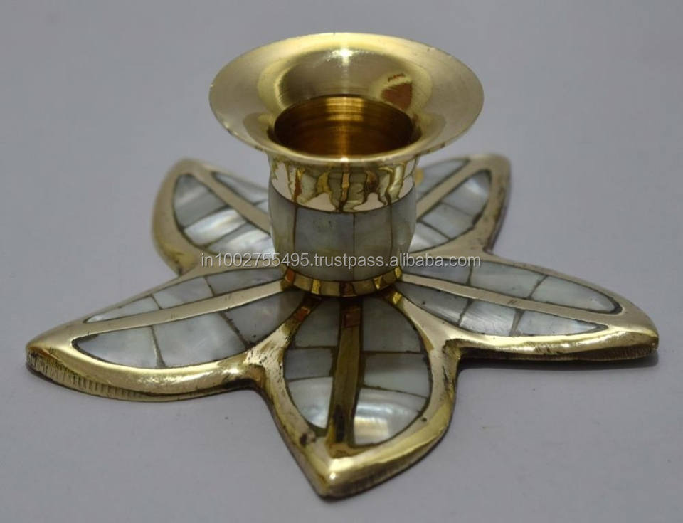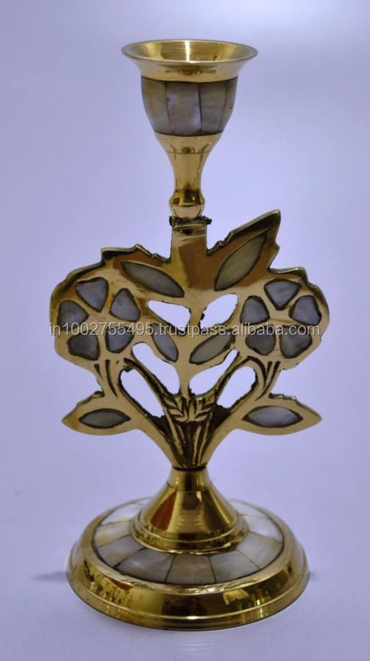 Brass Candle Stick Holders with Mother of Pearl Design Handmade Metal Home Decor