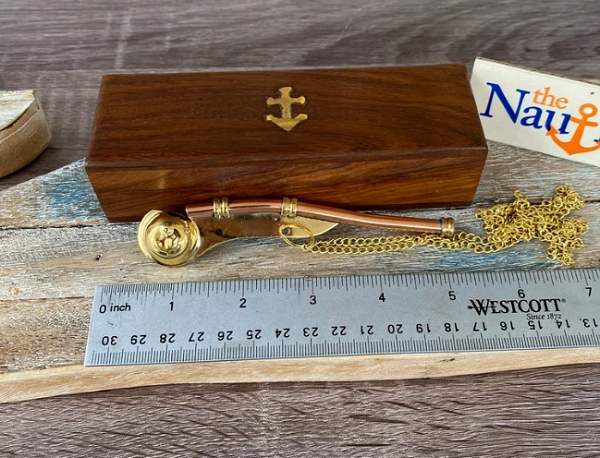 Brass Copper Boatswain Whistle w Chain & Wood Box-Bosun Call Pipe Necklace-Navy Captain -Old Vintage Style - Nautical Maritime