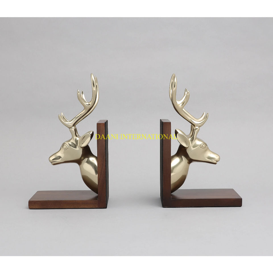 Brass Deer Head Bookends With Wooden Base Elegant Decorative Book Holder Luxury Home Office Library Decor And Gift For Readers