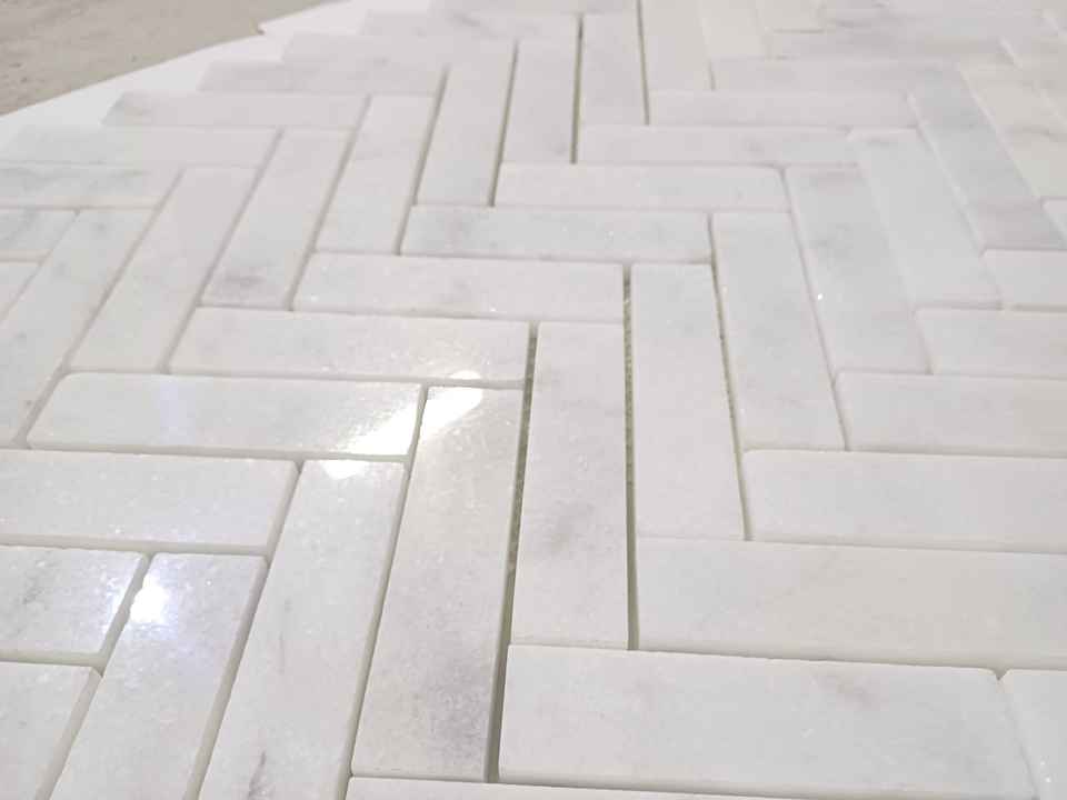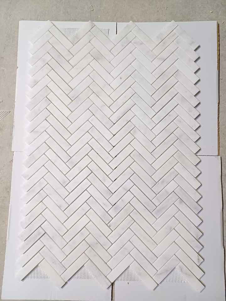 Brass Edging Marble Herringbone Carrara White Polished Mosaic Wall Cladding 1 Inch X 4 Inch Made in Turkiye 30.5x30.5cm Sheet