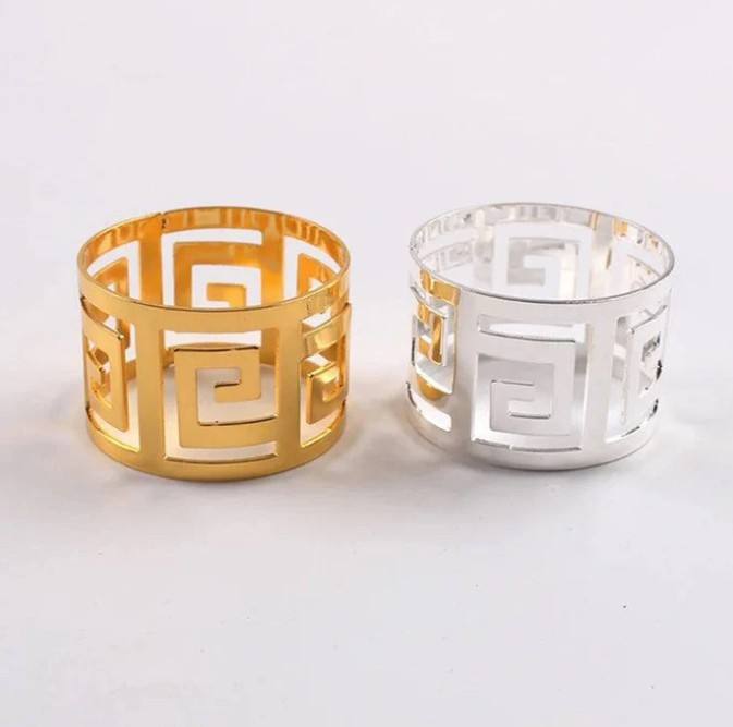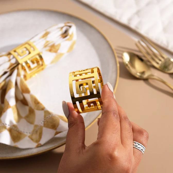Brass Gold Geometric Cutwork Napkin Rings Set | Luxury Hollow Design Napkin Holders | Durable Eco-Friendly Decorative Dining