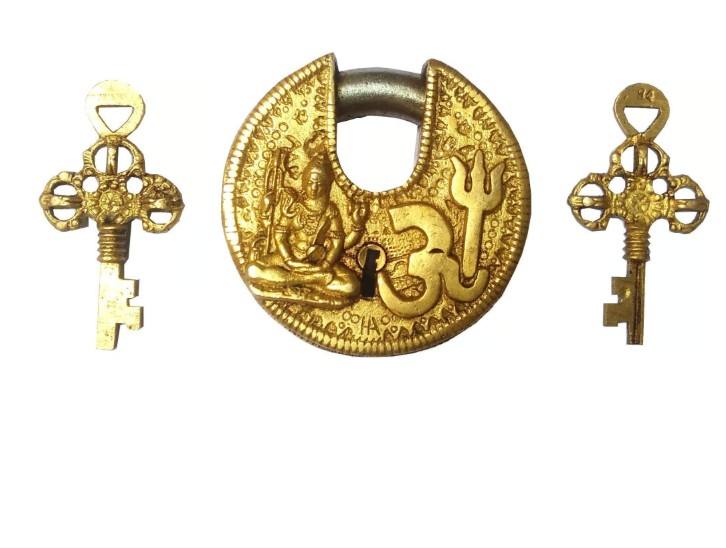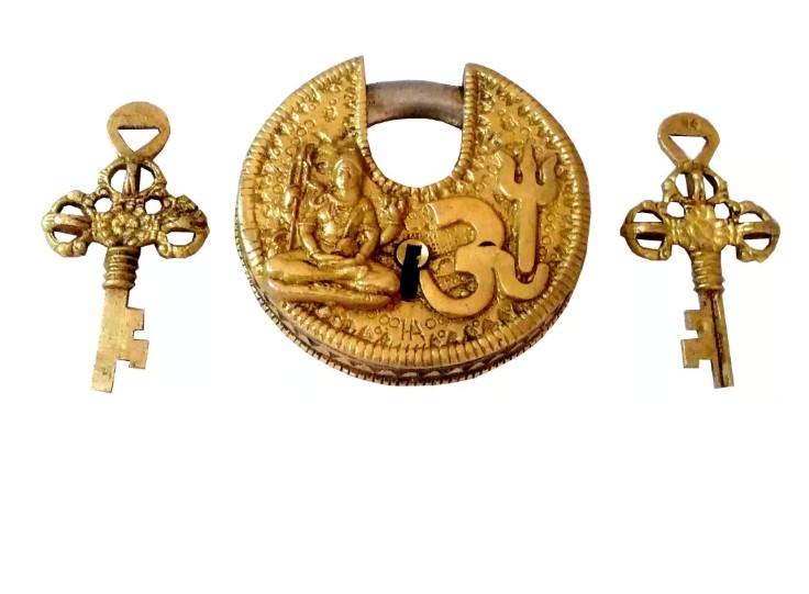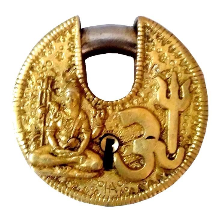 Brass Padlock Om Shiva Round Antique Design Spiritual Symbol Decorative Safety Lock Unique Vintage Collectible for Home Temple
