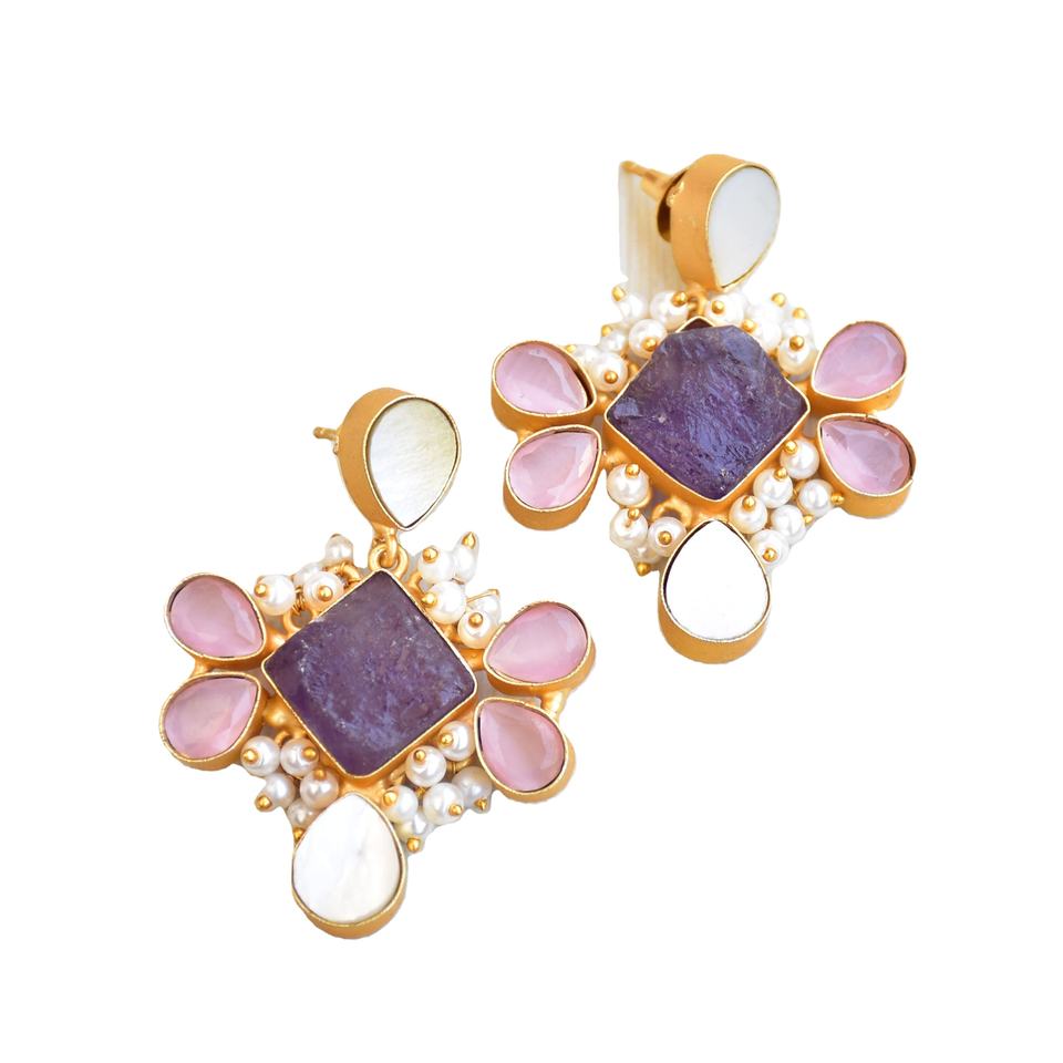 Brass Pearl Stud Earrings Wholesale Raw Natural Stone Design Satin Brass Finish Unique Designer Pattern Bulk Export Quality